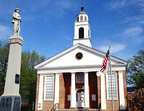 Courthouse 1848: This imposing brick structure was erected in 1848 and fronts on Prince Street. It has large columns and semi-columns on the front, two story windows, and almost three foot thick walls. In 1926 the late Alfred I. DuPont renovated the interior and installed a clock steeple as a gift to Essex County citizens. This building not only housed the Court but had a fireproof Clerk's Office and Record Room in the rear where the County records dating from 1686 were stored.